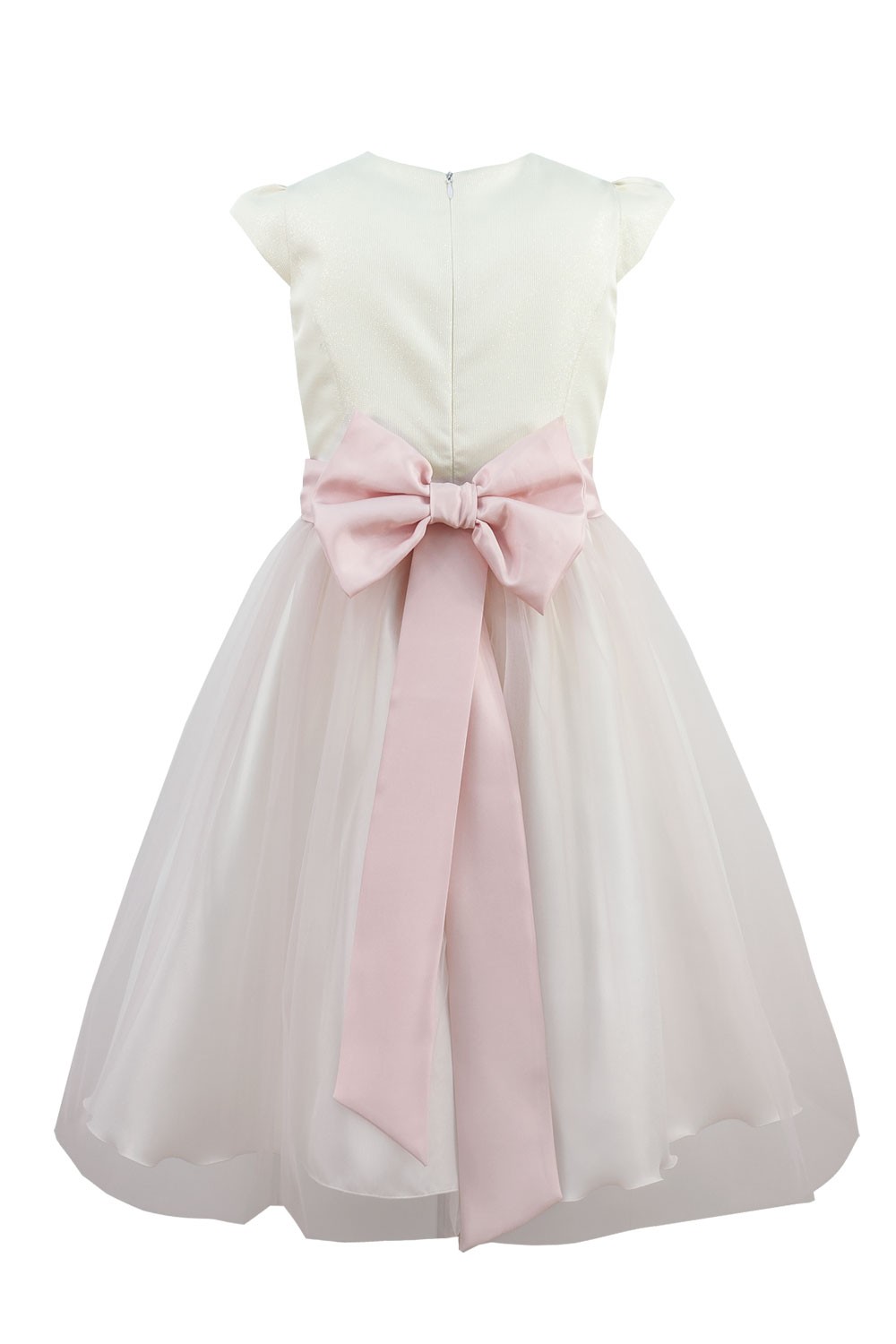 W pasie znajduję się elegancką szarfa, którą idealnie dopasujesz sukienkę do sylwetki. Sukienka posiada ozdobę w postaci dużej dodatkowej kokardy. Dół sukienki wykonany jest z trzech warstw: tiulu na satynie i podszewce z acetatu, wykończonej dodatkowo tiulem. Długość za kolano. Idealna propozycja na przebranie po Komunii Świętej, Wesela oraz inne wyjątkowe okazje.